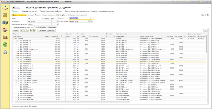 Производственная программа позволяет сгруппировать источники данных планирования производства и на основании этих данных выполнить разузлование, сформировать партии запуска, маршруты производства и потребности операций маршрутов. При формировании производственной программы учитываются такие параметры, как: спецификации, технологические карты, кратность, минимальные партии запуска, условия предшествования.