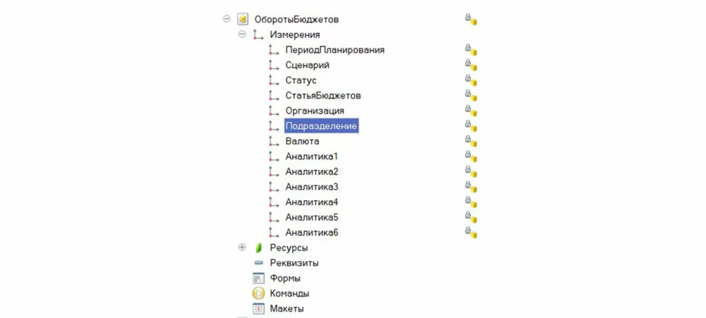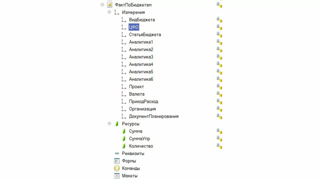 В частности, в регистре накопления «Факт по бюджетам» используется измерение «ЦФО», которое имеет тип справочника «Организации» с пользовательским наименованием «Организационная единица». При этом в регистре также присутствует измерение «Организация» с тем же типом справочника. Такая конструкция не является ошибкой: в 1С:Управление холдингом справочник «Организации» выполняет сразу две функции — хранит перечень юридических лиц холдинга и одновременно используется как справочник центров финансовой ответственности.