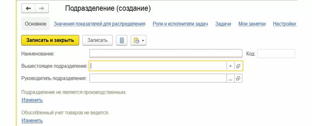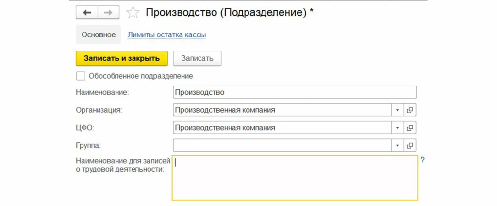 Форма элемента справочника «Подразделение» информационной базы 1С:УХ